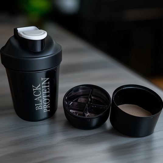 Le SHAKER de Black Protein dispose de 2 compartiments intégrés qui vous permettent de stocker plusieurs portions de compléments nutritionnels, par exemple des protéines, de la créatine, des vitamines, des gélules, des produits pré-et post-entraînement.